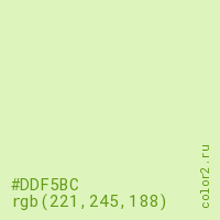 Цвет #DDF5BC в цветовой модели RGB обозначается тремя октетами (221, 245, 188) в десятичном формате и #DDF5BC в шестнадцатиричном (hex) формате, которые являются интенсивностью красного 221 (hex DD), интенсивность зелёного 245 (hex F5) и интенсивность синего 188 (hex BC).