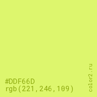 Цвет #DDF66D в цветовой модели RGB обозначается тремя октетами (221, 246, 109) в десятичном формате и #DDF66D в шестнадцатиричном (hex) формате, которые являются интенсивностью красного 221 (hex DD), интенсивность зелёного 246 (hex F6) и интенсивность синего 109 (hex 6D).