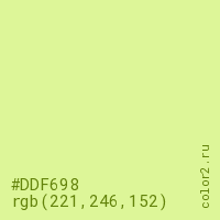 Цвет #DDF698 в цветовой модели RGB обозначается тремя октетами (221, 246, 152) в десятичном формате и #DDF698 в шестнадцатиричном (hex) формате, которые являются интенсивностью красного 221 (hex DD), интенсивность зелёного 246 (hex F6) и интенсивность синего 152 (hex 98).
