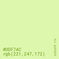 Цвет #DDF7AC в цветовой модели RGB обозначается тремя октетами (221, 247, 172) в десятичном формате и #DDF7AC в шестнадцатиричном (hex) формате, которые являются интенсивностью красного 221 (hex DD), интенсивность зелёного 247 (hex F7) и интенсивность синего 172 (hex AC).