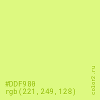 Цвет #DDF980 в цветовой модели RGB обозначается тремя октетами (221, 249, 128) в десятичном формате и #DDF980 в шестнадцатиричном (hex) формате, которые являются интенсивностью красного 221 (hex DD), интенсивность зелёного 249 (hex F9) и интенсивность синего 128 (hex 80).