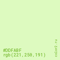Цвет #DDFABF в цветовой модели RGB обозначается тремя октетами (221, 250, 191) в десятичном формате и #DDFABF в шестнадцатиричном (hex) формате, которые являются интенсивностью красного 221 (hex DD), интенсивность зелёного 250 (hex FA) и интенсивность синего 191 (hex BF).