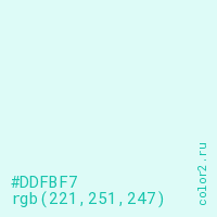 Цвет #DDFBF7 в цветовой модели RGB обозначается тремя октетами (221, 251, 247) в десятичном формате и #DDFBF7 в шестнадцатиричном (hex) формате, которые являются интенсивностью красного 221 (hex DD), интенсивность зелёного 251 (hex FB) и интенсивность синего 247 (hex F7).