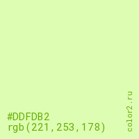 Цвет #DDFDB2 в цветовой модели RGB обозначается тремя октетами (221, 253, 178) в десятичном формате и #DDFDB2 в шестнадцатиричном (hex) формате, которые являются интенсивностью красного 221 (hex DD), интенсивность зелёного 253 (hex FD) и интенсивность синего 178 (hex B2).
