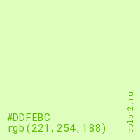 Цвет #DDFEBC в цветовой модели RGB обозначается тремя октетами (221, 254, 188) в десятичном формате и #DDFEBC в шестнадцатиричном (hex) формате, которые являются интенсивностью красного 221 (hex DD), интенсивность зелёного 254 (hex FE) и интенсивность синего 188 (hex BC).