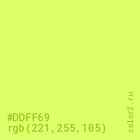 Цвет #DDFF69 в цветовой модели RGB обозначается тремя октетами (221, 255, 105) в десятичном формате и #DDFF69 в шестнадцатиричном (hex) формате, которые являются интенсивностью красного 221 (hex DD), интенсивность зелёного 255 (hex FF) и интенсивность синего 105 (hex 69).