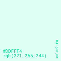 Цвет #DDFFF4 в цветовой модели RGB обозначается тремя октетами (221, 255, 244) в десятичном формате и #DDFFF4 в шестнадцатиричном (hex) формате, которые являются интенсивностью красного 221 (hex DD), интенсивность зелёного 255 (hex FF) и интенсивность синего 244 (hex F4).