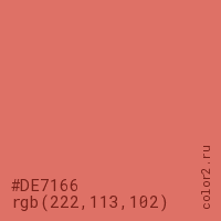 Цвет #DE7166 в цветовой модели RGB обозначается тремя октетами (222, 113, 102) в десятичном формате и #DE7166 в шестнадцатиричном (hex) формате, которые являются интенсивностью красного 222 (hex DE), интенсивность зелёного 113 (hex 71) и интенсивность синего 102 (hex 66).