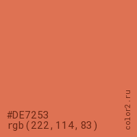 Цвет #DE7253 в цветовой модели RGB обозначается тремя октетами (222, 114, 83) в десятичном формате и #DE7253 в шестнадцатиричном (hex) формате, которые являются интенсивностью красного 222 (hex DE), интенсивность зелёного 114 (hex 72) и интенсивность синего 83 (hex 53).
