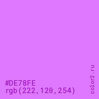 Цвет RGB(222, 120, 254) в процентом отношении количества цвета состоит из 87.1% красного (red), 47.1% зелёного (green) и 99.6% синего (blue).