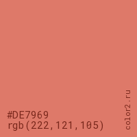 Цвет #DE7969 в цветовой модели RGB обозначается тремя октетами (222, 121, 105) в десятичном формате и #DE7969 в шестнадцатиричном (hex) формате, которые являются интенсивностью красного 222 (hex DE), интенсивность зелёного 121 (hex 79) и интенсивность синего 105 (hex 69).