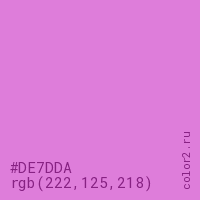 Цвет #DE7DDA в цветовой модели RGB обозначается тремя октетами (222, 125, 218) в десятичном формате и #DE7DDA в шестнадцатиричном (hex) формате, которые являются интенсивностью красного 222 (hex DE), интенсивность зелёного 125 (hex 7D) и интенсивность синего 218 (hex DA).