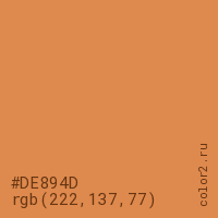 Цвет #DE894D в цветовой модели RGB обозначается тремя октетами (222, 137, 77) в десятичном формате и #DE894D в шестнадцатиричном (hex) формате, которые являются интенсивностью красного 222 (hex DE), интенсивность зелёного 137 (hex 89) и интенсивность синего 77 (hex 4D).