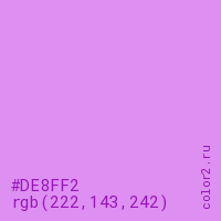 Цвет #DE8FF2 в цветовой модели RGB обозначается тремя октетами (222, 143, 242) в десятичном формате и #DE8FF2 в шестнадцатиричном (hex) формате, которые являются интенсивностью красного 222 (hex DE), интенсивность зелёного 143 (hex 8F) и интенсивность синего 242 (hex F2).