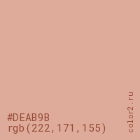 Цвет #DEAB9B в цветовой модели RGB обозначается тремя октетами (222, 171, 155) в десятичном формате и #DEAB9B в шестнадцатиричном (hex) формате, которые являются интенсивностью красного 222 (hex DE), интенсивность зелёного 171 (hex AB) и интенсивность синего 155 (hex 9B).