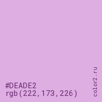 Цвет #DEADE2 в цветовой модели RGB обозначается тремя октетами (222, 173, 226) в десятичном формате и #DEADE2 в шестнадцатиричном (hex) формате, которые являются интенсивностью красного 222 (hex DE), интенсивность зелёного 173 (hex AD) и интенсивность синего 226 (hex E2).