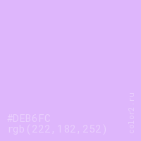 Цвет #DEB6FC в цветовой модели RGB обозначается тремя октетами (222, 182, 252) в десятичном формате и #DEB6FC в шестнадцатиричном (hex) формате, которые являются интенсивностью красного 222 (hex DE), интенсивность зелёного 182 (hex B6) и интенсивность синего 252 (hex FC).