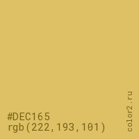 Цвет #DEC165 в цветовой модели RGB обозначается тремя октетами (222, 193, 101) в десятичном формате и #DEC165 в шестнадцатиричном (hex) формате, которые являются интенсивностью красного 222 (hex DE), интенсивность зелёного 193 (hex C1) и интенсивность синего 101 (hex 65).
