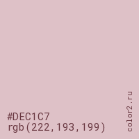 Цвет #DEC1C7 в цветовой модели RGB обозначается тремя октетами (222, 193, 199) в десятичном формате и #DEC1C7 в шестнадцатиричном (hex) формате, которые являются интенсивностью красного 222 (hex DE), интенсивность зелёного 193 (hex C1) и интенсивность синего 199 (hex C7).
