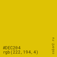 Цвет #DEC204 в цветовой модели RGB обозначается тремя октетами (222, 194, 4) в десятичном формате и #DEC204 в шестнадцатиричном (hex) формате, которые являются интенсивностью красного 222 (hex DE), интенсивность зелёного 194 (hex C2) и интенсивность синего 4 (hex 04).