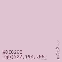 Цвет #DEC2CE в цветовой модели RGB обозначается тремя октетами (222, 194, 206) в десятичном формате и #DEC2CE в шестнадцатиричном (hex) формате, которые являются интенсивностью красного 222 (hex DE), интенсивность зелёного 194 (hex C2) и интенсивность синего 206 (hex CE).