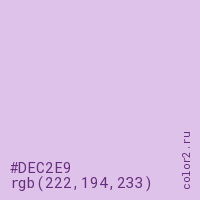 Цвет #DEC2E9 в цветовой модели RGB обозначается тремя октетами (222, 194, 233) в десятичном формате и #DEC2E9 в шестнадцатиричном (hex) формате, которые являются интенсивностью красного 222 (hex DE), интенсивность зелёного 194 (hex C2) и интенсивность синего 233 (hex E9).