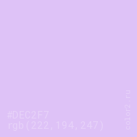 Цвет #DEC2F7 в цветовой модели RGB обозначается тремя октетами (222, 194, 247) в десятичном формате и #DEC2F7 в шестнадцатиричном (hex) формате, которые являются интенсивностью красного 222 (hex DE), интенсивность зелёного 194 (hex C2) и интенсивность синего 247 (hex F7).