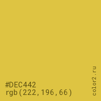 Цвет #DEC442 в цветовой модели RGB обозначается тремя октетами (222, 196, 66) в десятичном формате и #DEC442 в шестнадцатиричном (hex) формате, которые являются интенсивностью красного 222 (hex DE), интенсивность зелёного 196 (hex C4) и интенсивность синего 66 (hex 42).