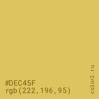 Цвет #DEC45F в цветовой модели RGB обозначается тремя октетами (222, 196, 95) в десятичном формате и #DEC45F в шестнадцатиричном (hex) формате, которые являются интенсивностью красного 222 (hex DE), интенсивность зелёного 196 (hex C4) и интенсивность синего 95 (hex 5F).