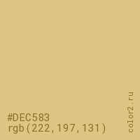 Цвет #DEC583 в цветовой модели RGB обозначается тремя октетами (222, 197, 131) в десятичном формате и #DEC583 в шестнадцатиричном (hex) формате, которые являются интенсивностью красного 222 (hex DE), интенсивность зелёного 197 (hex C5) и интенсивность синего 131 (hex 83).
