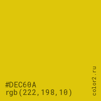 Цвет #DEC60A в цветовой модели RGB обозначается тремя октетами (222, 198, 10) в десятичном формате и #DEC60A в шестнадцатиричном (hex) формате, которые являются интенсивностью красного 222 (hex DE), интенсивность зелёного 198 (hex C6) и интенсивность синего 10 (hex 0A).