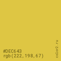 Цвет #DEC643 в цветовой модели RGB обозначается тремя октетами (222, 198, 67) в десятичном формате и #DEC643 в шестнадцатиричном (hex) формате, которые являются интенсивностью красного 222 (hex DE), интенсивность зелёного 198 (hex C6) и интенсивность синего 67 (hex 43).