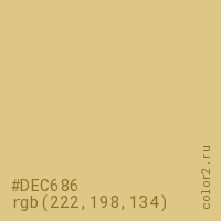 Цвет #DEC686 в цветовой модели RGB обозначается тремя октетами (222, 198, 134) в десятичном формате и #DEC686 в шестнадцатиричном (hex) формате, которые являются интенсивностью красного 222 (hex DE), интенсивность зелёного 198 (hex C6) и интенсивность синего 134 (hex 86).