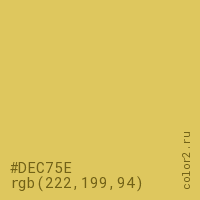 Цвет #DEC75E в цветовой модели RGB обозначается тремя октетами (222, 199, 94) в десятичном формате и #DEC75E в шестнадцатиричном (hex) формате, которые являются интенсивностью красного 222 (hex DE), интенсивность зелёного 199 (hex C7) и интенсивность синего 94 (hex 5E).