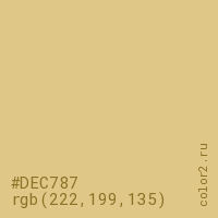 Цвет #DEC787 в цветовой модели RGB обозначается тремя октетами (222, 199, 135) в десятичном формате и #DEC787 в шестнадцатиричном (hex) формате, которые являются интенсивностью красного 222 (hex DE), интенсивность зелёного 199 (hex C7) и интенсивность синего 135 (hex 87).