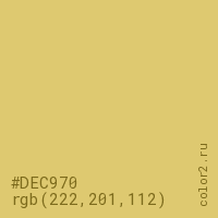 Цвет #DEC970 в цветовой модели RGB обозначается тремя октетами (222, 201, 112) в десятичном формате и #DEC970 в шестнадцатиричном (hex) формате, которые являются интенсивностью красного 222 (hex DE), интенсивность зелёного 201 (hex C9) и интенсивность синего 112 (hex 70).