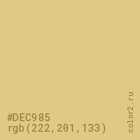 Цвет #DEC985 в цветовой модели RGB обозначается тремя октетами (222, 201, 133) в десятичном формате и #DEC985 в шестнадцатиричном (hex) формате, которые являются интенсивностью красного 222 (hex DE), интенсивность зелёного 201 (hex C9) и интенсивность синего 133 (hex 85).