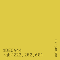 Цвет #DECA44 в цветовой модели RGB обозначается тремя октетами (222, 202, 68) в десятичном формате и #DECA44 в шестнадцатиричном (hex) формате, которые являются интенсивностью красного 222 (hex DE), интенсивность зелёного 202 (hex CA) и интенсивность синего 68 (hex 44).