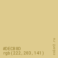 Цвет #DECB8D в цветовой модели RGB обозначается тремя октетами (222, 203, 141) в десятичном формате и #DECB8D в шестнадцатиричном (hex) формате, которые являются интенсивностью красного 222 (hex DE), интенсивность зелёного 203 (hex CB) и интенсивность синего 141 (hex 8D).