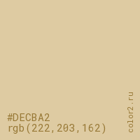 Цвет #DECBA2 в цветовой модели RGB обозначается тремя октетами (222, 203, 162) в десятичном формате и #DECBA2 в шестнадцатиричном (hex) формате, которые являются интенсивностью красного 222 (hex DE), интенсивность зелёного 203 (hex CB) и интенсивность синего 162 (hex A2).