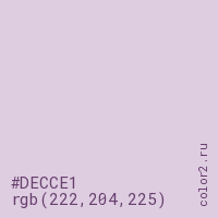 Цвет #DECCE1 в цветовой модели RGB обозначается тремя октетами (222, 204, 225) в десятичном формате и #DECCE1 в шестнадцатиричном (hex) формате, которые являются интенсивностью красного 222 (hex DE), интенсивность зелёного 204 (hex CC) и интенсивность синего 225 (hex E1).