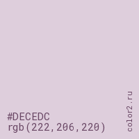 Цвет #DECEDC в цветовой модели RGB обозначается тремя октетами (222, 206, 220) в десятичном формате и #DECEDC в шестнадцатиричном (hex) формате, которые являются интенсивностью красного 222 (hex DE), интенсивность зелёного 206 (hex CE) и интенсивность синего 220 (hex DC).