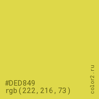 Цвет #DED849 в цветовой модели RGB обозначается тремя октетами (222, 216, 73) в десятичном формате и #DED849 в шестнадцатиричном (hex) формате, которые являются интенсивностью красного 222 (hex DE), интенсивность зелёного 216 (hex D8) и интенсивность синего 73 (hex 49).