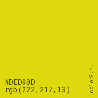 Цвет #DED90D в цветовой модели RGB обозначается тремя октетами (222, 217, 13) в десятичном формате и #DED90D в шестнадцатиричном (hex) формате, которые являются интенсивностью красного 222 (hex DE), интенсивность зелёного 217 (hex D9) и интенсивность синего 13 (hex 0D).