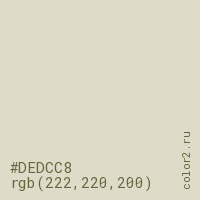 Цвет #DEDCC8 в цветовой модели RGB обозначается тремя октетами (222, 220, 200) в десятичном формате и #DEDCC8 в шестнадцатиричном (hex) формате, которые являются интенсивностью красного 222 (hex DE), интенсивность зелёного 220 (hex DC) и интенсивность синего 200 (hex C8).