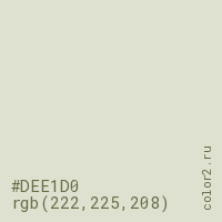 Цвет #DEE1D0 в цветовой модели RGB обозначается тремя октетами (222, 225, 208) в десятичном формате и #DEE1D0 в шестнадцатиричном (hex) формате, которые являются интенсивностью красного 222 (hex DE), интенсивность зелёного 225 (hex E1) и интенсивность синего 208 (hex D0).