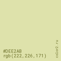 Цвет #DEE2AB в цветовой модели RGB обозначается тремя октетами (222, 226, 171) в десятичном формате и #DEE2AB в шестнадцатиричном (hex) формате, которые являются интенсивностью красного 222 (hex DE), интенсивность зелёного 226 (hex E2) и интенсивность синего 171 (hex AB).