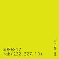 Цвет #DEE312 в цветовой модели RGB обозначается тремя октетами (222, 227, 18) в десятичном формате и #DEE312 в шестнадцатиричном (hex) формате, которые являются интенсивностью красного 222 (hex DE), интенсивность зелёного 227 (hex E3) и интенсивность синего 18 (hex 12).