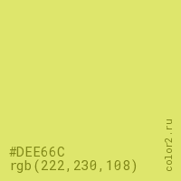 Цвет #DEE66C в цветовой модели RGB обозначается тремя октетами (222, 230, 108) в десятичном формате и #DEE66C в шестнадцатиричном (hex) формате, которые являются интенсивностью красного 222 (hex DE), интенсивность зелёного 230 (hex E6) и интенсивность синего 108 (hex 6C).