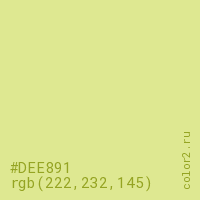 Цвет #DEE891 в цветовой модели RGB обозначается тремя октетами (222, 232, 145) в десятичном формате и #DEE891 в шестнадцатиричном (hex) формате, которые являются интенсивностью красного 222 (hex DE), интенсивность зелёного 232 (hex E8) и интенсивность синего 145 (hex 91).